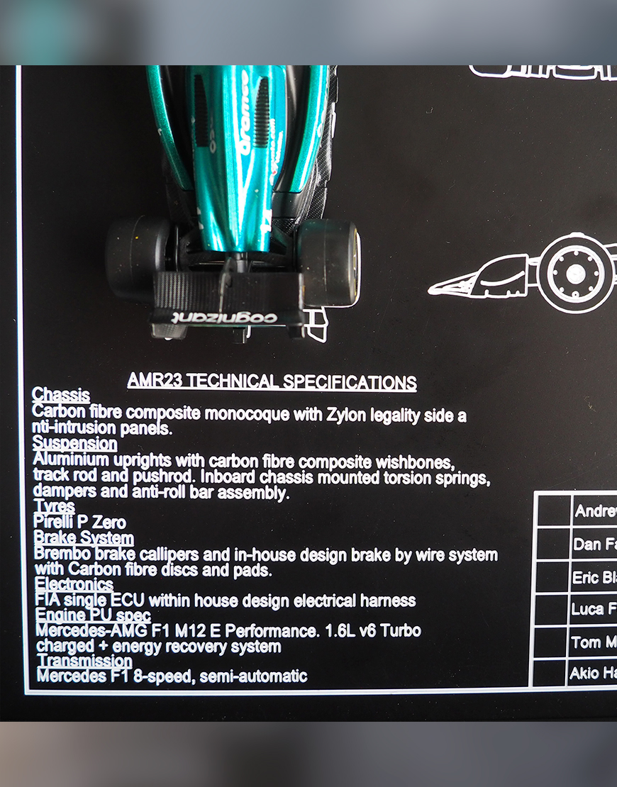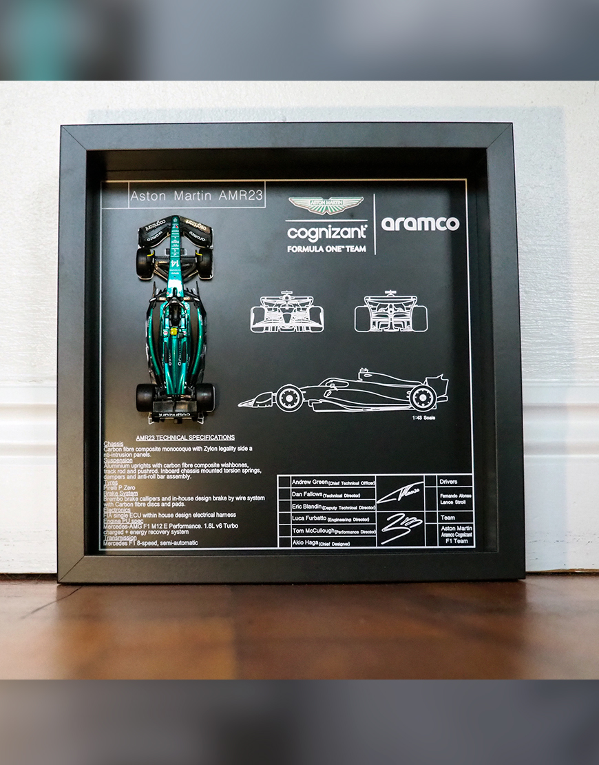 Embrace the spirit of innovation with this exclusive framed tribute to the Aston Martin AMR23, driven by Fernando Alonso and Lance Stroll. Measuring 27×27 cm, this collector’s edition features the official Bburago 1:43 die-cast model, mounted over a CNC-engraved backdrop.