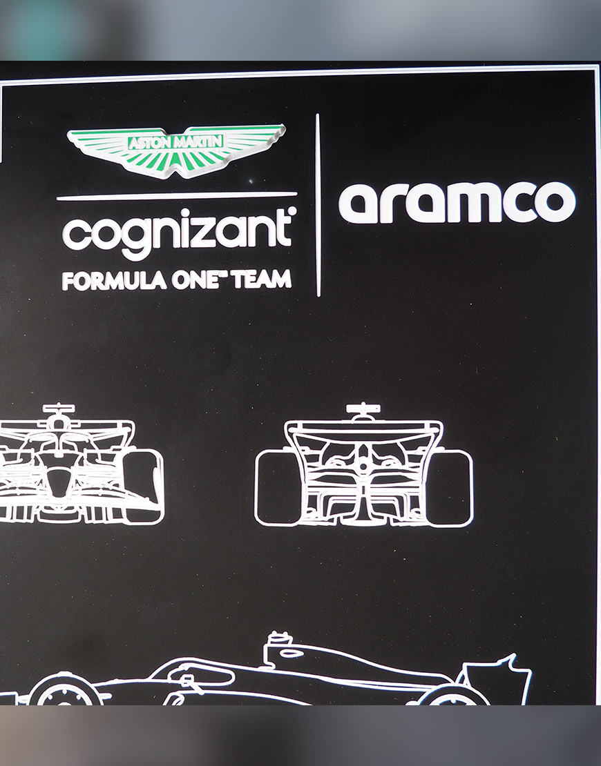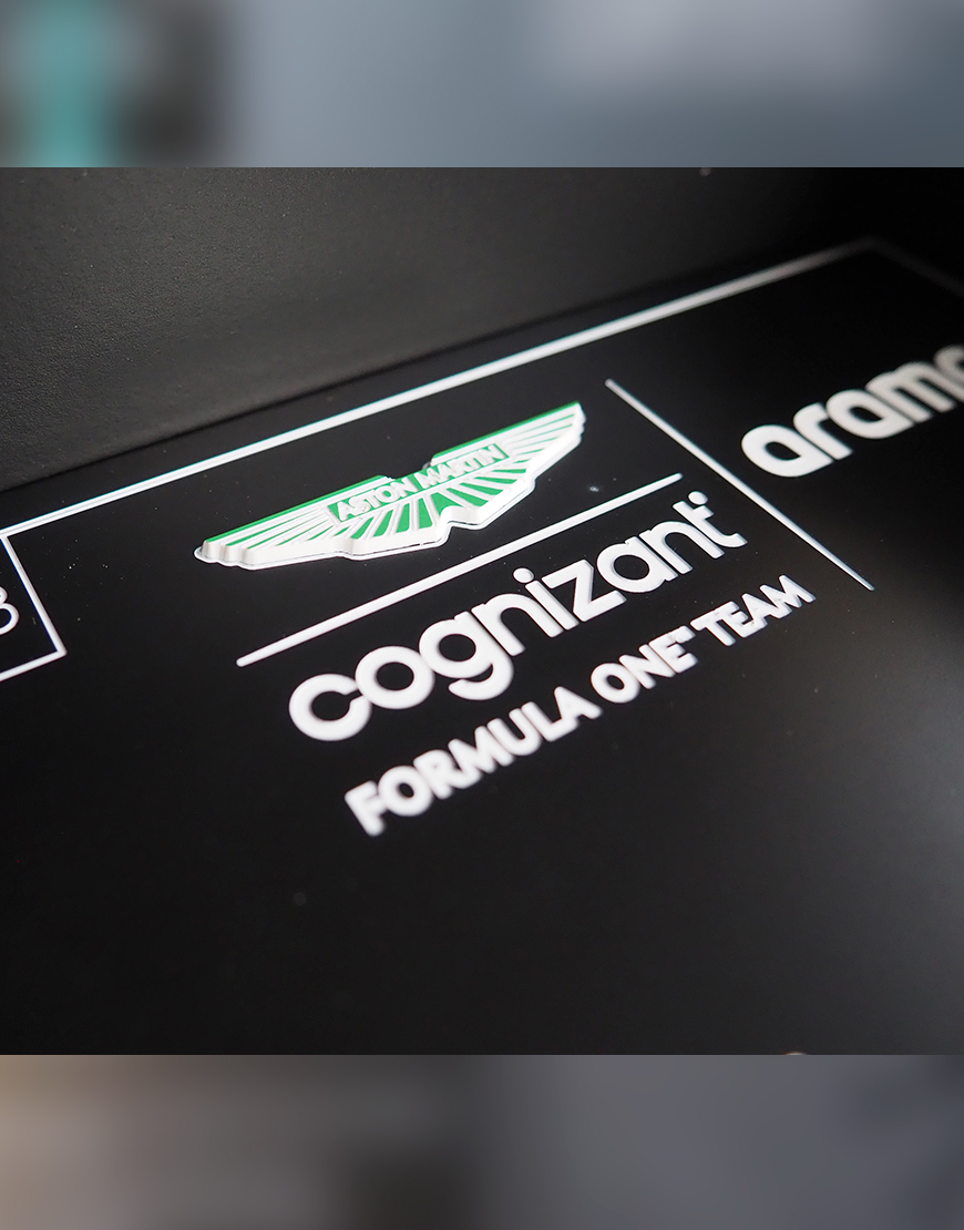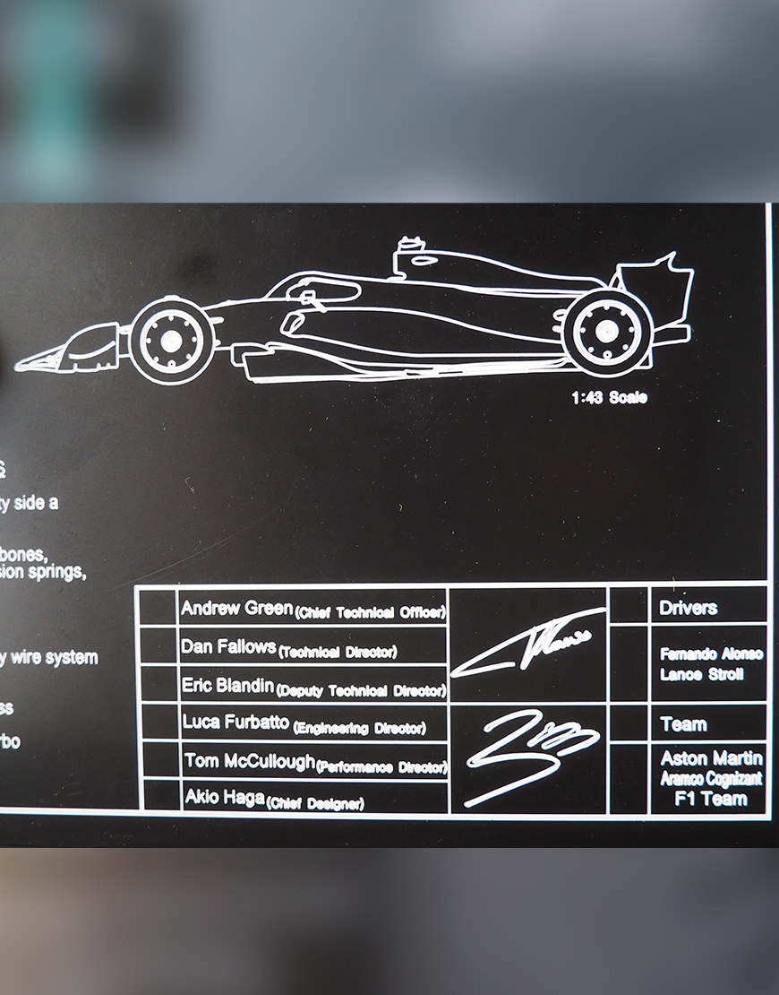 The elegant black-and-white dual-layer composition enhances the legendary British Racing Green, echoing Aston Martin’s balance of heritage and modern performance. The engraved details include design schematics, technical specifications, and driver signatures, transforming this piece into a refined masterpiece for collectors.