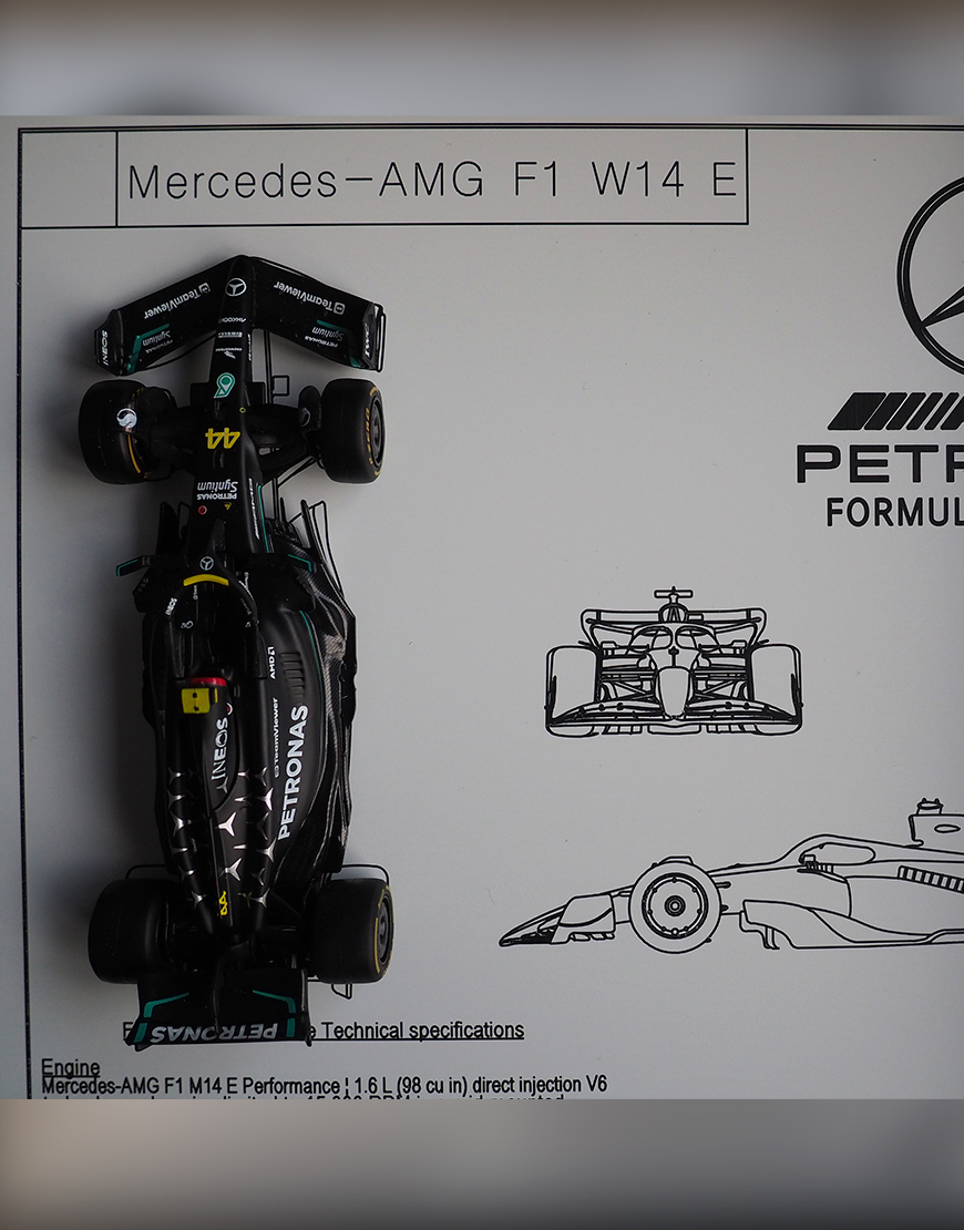 Celebrate Formula 1 excellence with this exclusive framed tribute to the Mercedes-AMG F1 W14 E, driven by Lewis Hamilton. Measuring 27×27 cm, this premium display showcases the official Bburago 1:43 die-cast model, precisely mounted on a CNC-engraved backdrop.