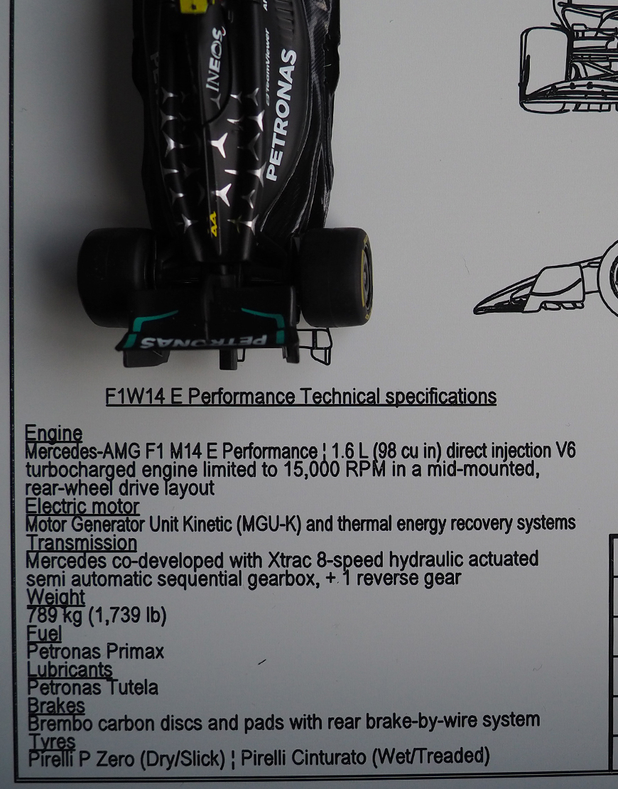 Exclusive Mercedes-AMG F1 W14 E frame (27×27 cm) with official Bburago 1:43 model and CNC-engraved black/white backdrop. A premium collector’s piece with schematics and Hamilton’s signature, crafted in Ireland
